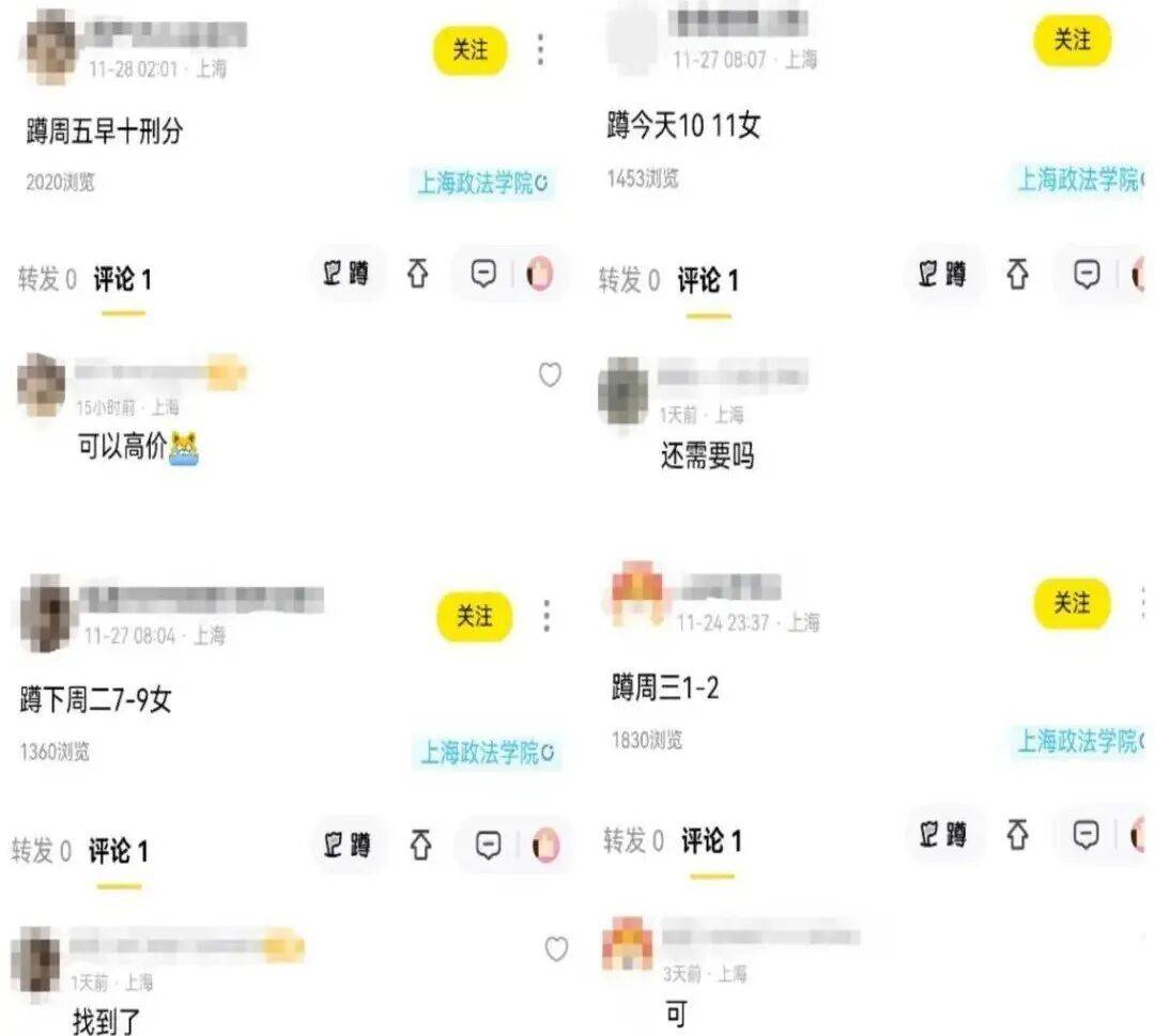 今年9月至11月,记者前往沪上西南地区两所高校,跟随参加交易的代课者与代考者。记者发现,目前该社交平台已屏蔽相关关键词,但仍可用谐音、表情包绕过审核,用“暗语”交易。