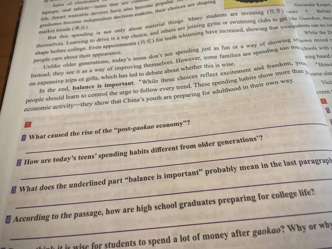 每篇文章后的练习题,题型和考试类似,有阅读理解、完形填空、阅读后回答问题等。