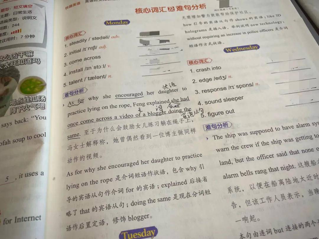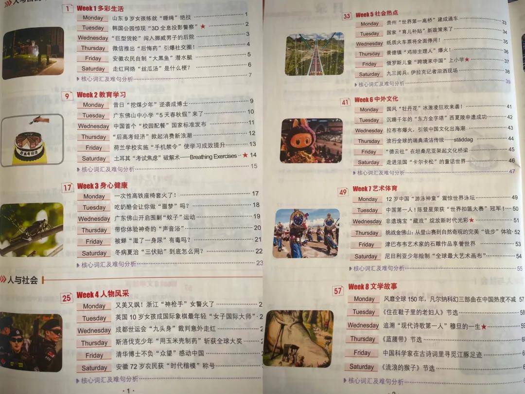 每周后面有每课的核心词汇和难句分析,便于积累。