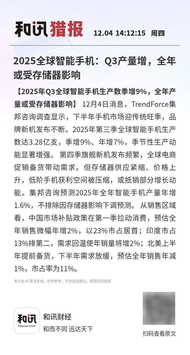 【2025年Q3全球智能手机生产数季增9%,全年产量或受存储器影响】12月4日消息,TrendForce集邦咨询调查显示,下半年手机市场迎传统旺季,品牌新机发布不断。2025年第三季全球智能手机生产数达3.28亿支,季增9%、年增7%,季节性生产动能显著增强。 第四季旗舰新机发布频繁,全球电商促销备货带动需求。但存储器供应紧缩、价格上升,低阶手机获利空间被压缩,或抵销部分增长动能。集邦咨询预测2025年全年智能手机产量年增1.6%,不排除因存储器影响下调预测。 从销售区域看,中国市场补贴政策在第一季拉动消费,预估全年销售微幅年增2%,以23%市占居首;印度市占13%排第二,需求回温使年销量将增2%;北美上半年提前备货,下半年需求放缓,预估全年销售年减1%,市占率为11%。