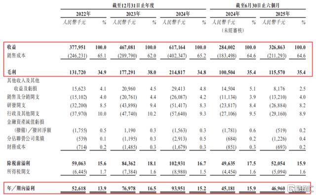 2022年、2023年、2024年及2025年1-6月(报告期),公司的收入分别为3.78亿元、4.67亿元、6.17亿元、3.27亿元,净利润分别为5262万元、7698万元、9395万元、4696万元,毛利率分别为34.9%、38%、34.8%、35.4%。