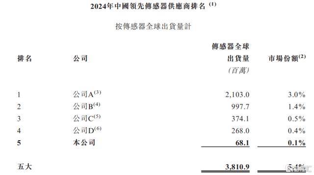 根据弗若斯特沙利文资料,2024年,中国前五大传感器供应商的市占率(以全球传感器出货量计)仅占约5.4%。