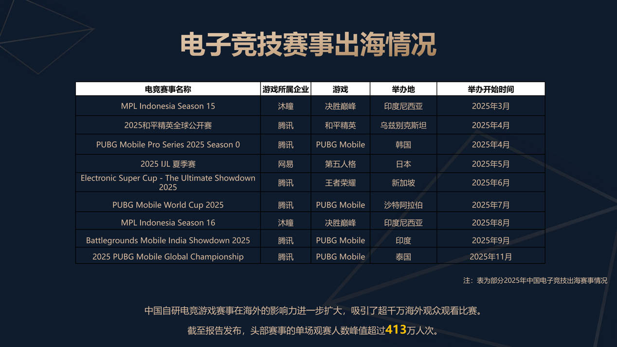 中国自研电竞游戏赛事的海外影响力进一步扩大,吸引超千万海外观众观赛,头部赛事单场观赛人数峰值超413万人次。