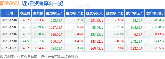 证券之星消息,截至2025年12月4日收盘,新光光电(688011)报收于43.28元,上涨0.23%,换手率0.94%,成交量9400.0手,成交额4041.53万元。