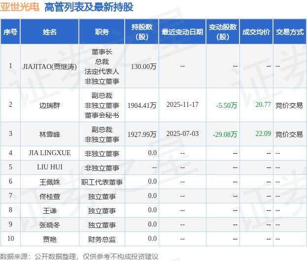 亚世光电近半年内的董监高及核心技术人员增减持详情如下: