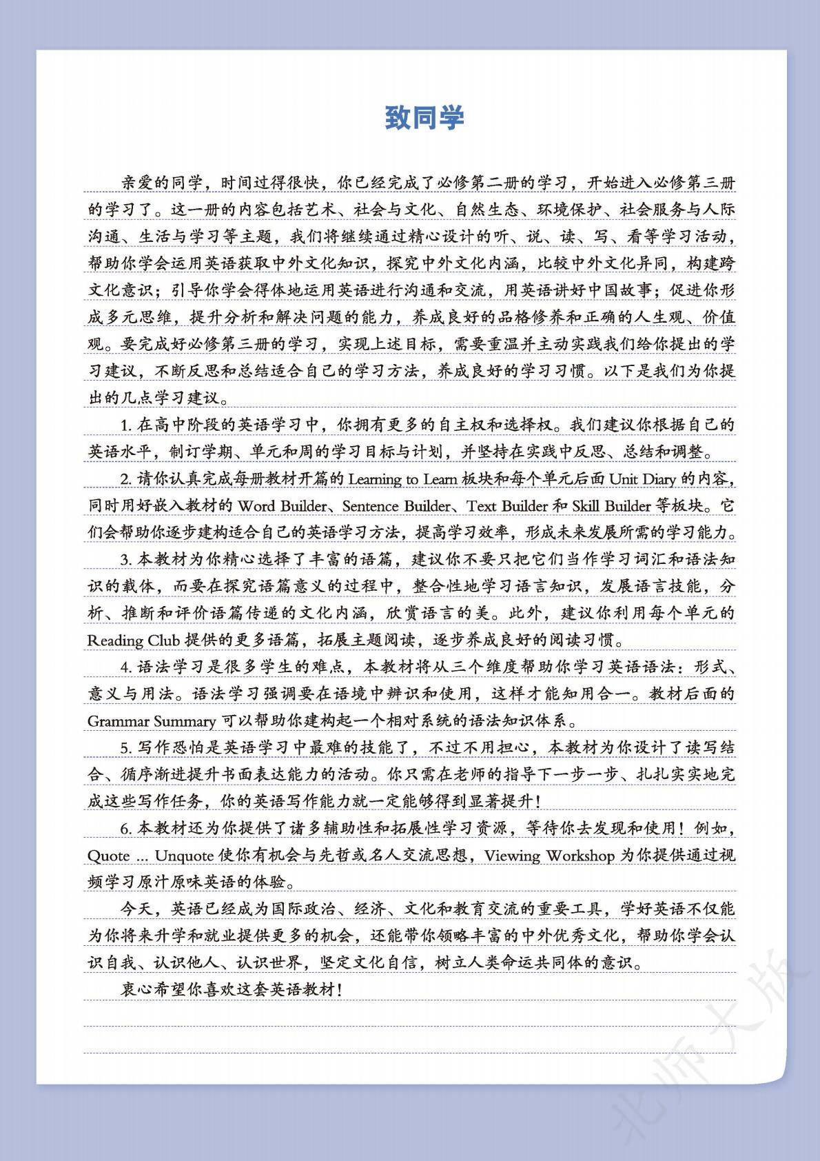 为了帮助高中生自主预习与有效复习,我们整理了2026新教材北师大版高中英语必修三电子课本,教材突出跨学科思维与实际应用能力的培养,下面以图片的形式呈现给大家,希望可以帮助到大家。
