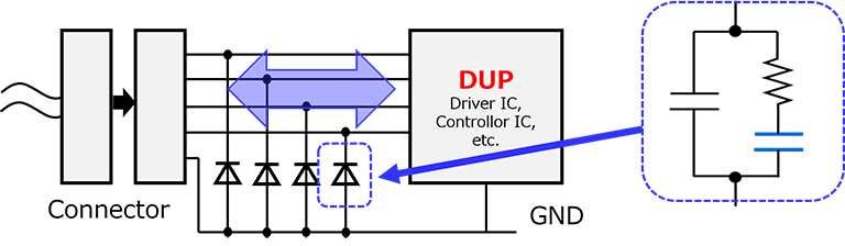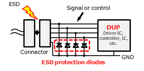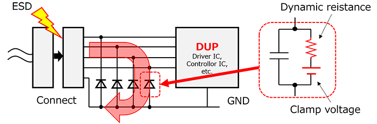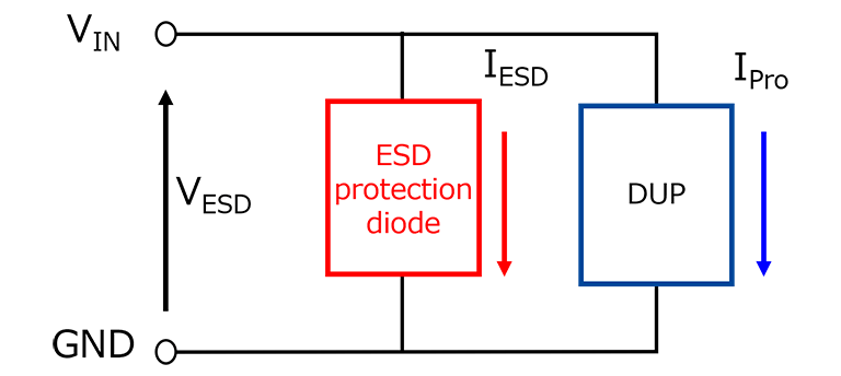 ESD保护电路与DUP并联,如上所示。因此,施加在ESD静电二极管两端的ESD浪涌电压(VESD)也加在DUP两端。(实际上,由于电路板走线的寄生电感和电容,施加到ESD静电二极管和DUP的电压和时间略有不同。)流入DUP(IPro)的电流受其内部有源电路状态的影响,并取决于VESD。