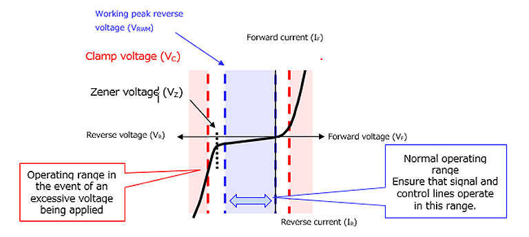 ESD静电二极管利用pn结二极管的齐纳击穿*。如下图所示,pn结二极管在大约0.7 V时正向导通,在齐纳电压(VZ)处开始反向导通,齐纳电压因二极管而异。ESD静电二极管利用pn结反向偏置特性。