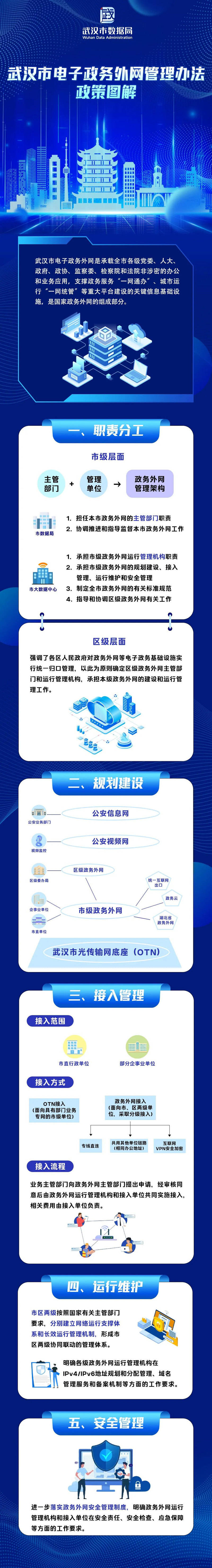 为进一步加强全市电子政务外网管理,确保武汉市电子政务外网安全、可靠、高效和稳定运行,武汉市信息中心编制了《武汉市电子政务外网管理办法(试行)》(以下简称“政务外网”)。