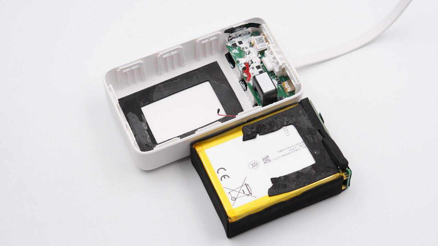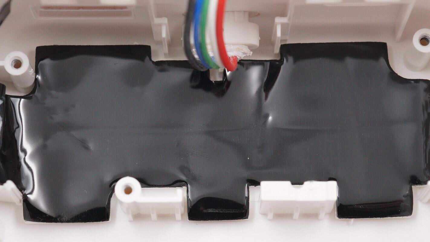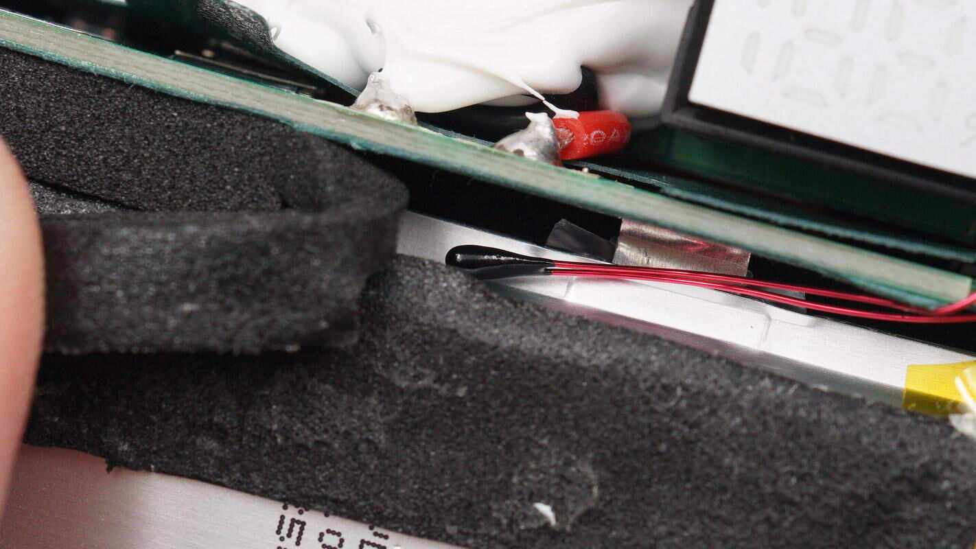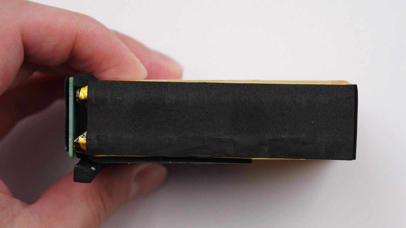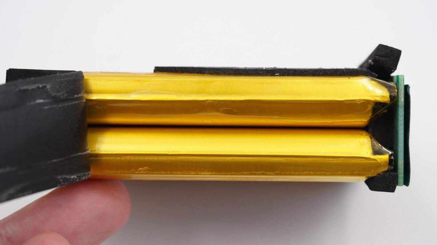 电池组侧面特写,可以看到电池保护板和电芯打包成了一个模组,侧面同样覆盖了整条黑色泡棉。