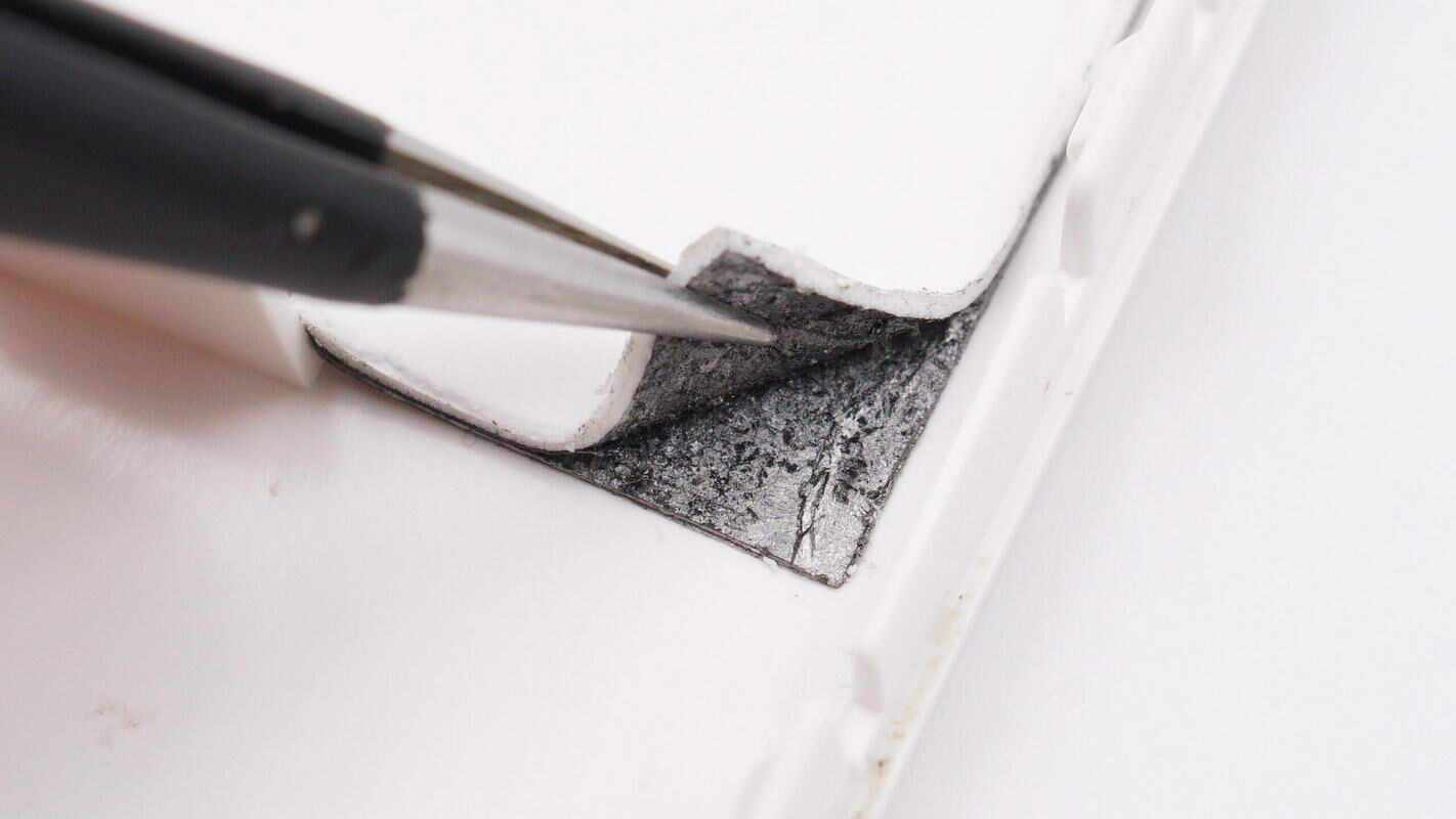 撕开右侧矩形区域一脚,可以看到为一整块导热石墨片,可以快速摊开热量、提高散热面积。