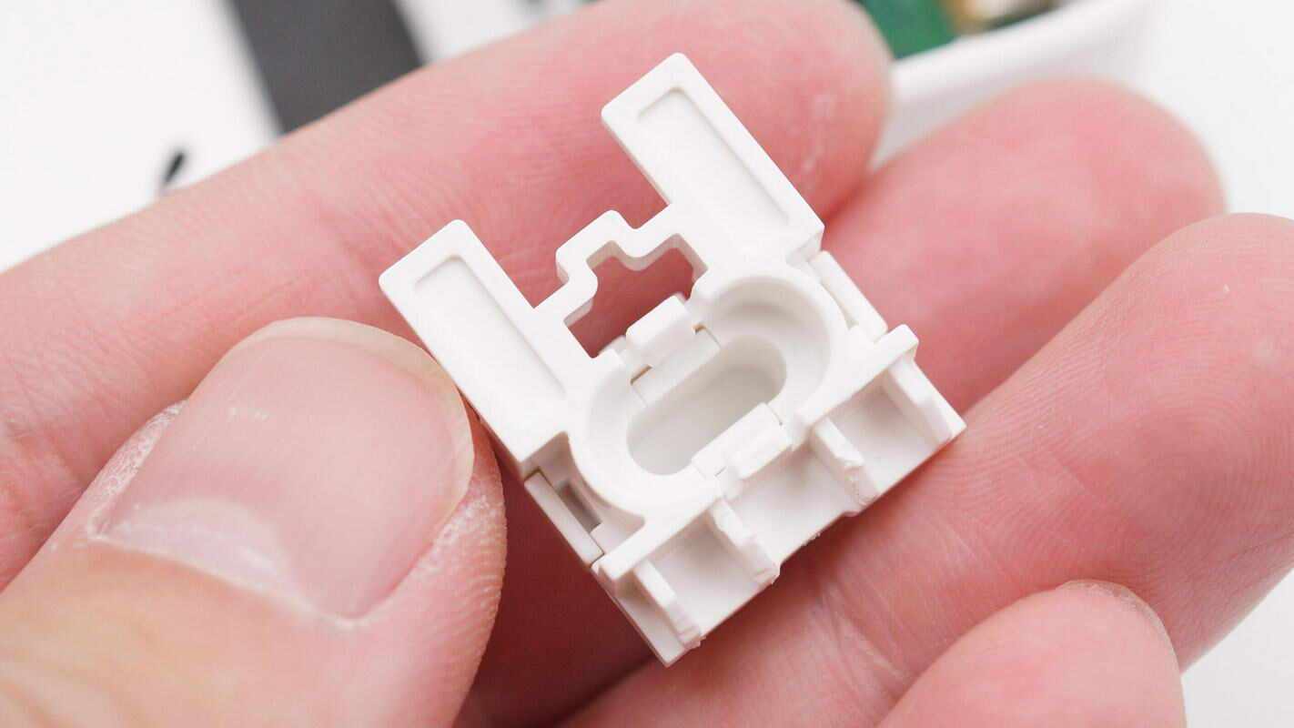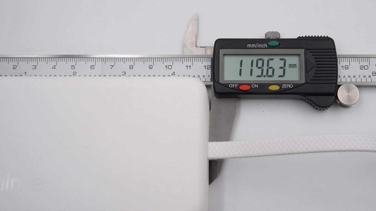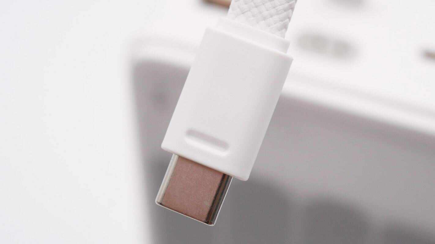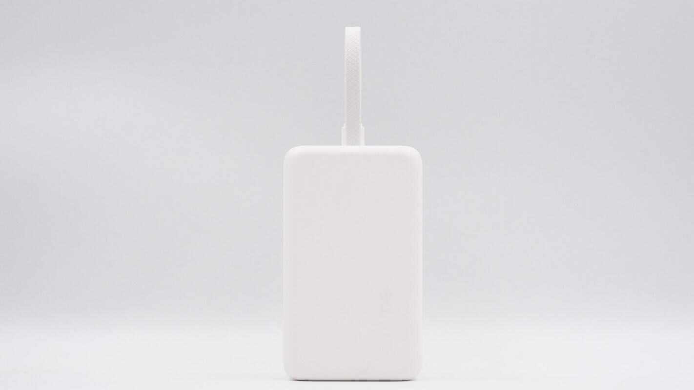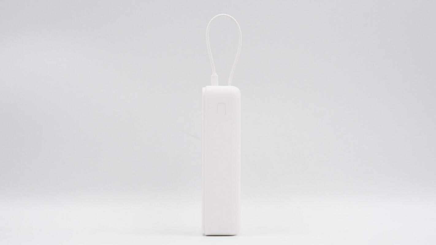 自带线末端为白色 USB-C 插头,插头上设有与机身顶部收纳槽内卡扣配合的定位槽,插头扣入收纳位后由该槽与卡扣啮合,实现稳固锁止,避免晃动和意外脱出,同时便于单手取用。