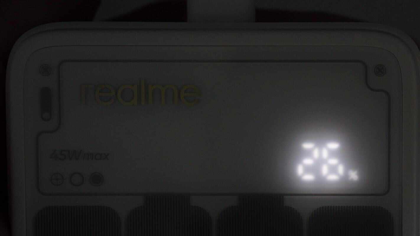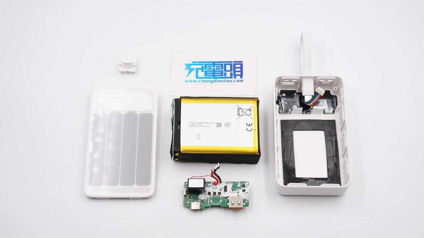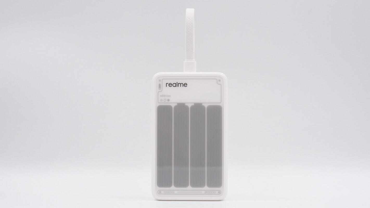 这次充电头网拿到的是雪境白配色,产品以白色为底色,正面上部印有realme 品牌与装饰框,下方是四条竖向排列的电芯造型纹理,自带线从机身顶部伸出,整体视觉很有机械感和科技感。
