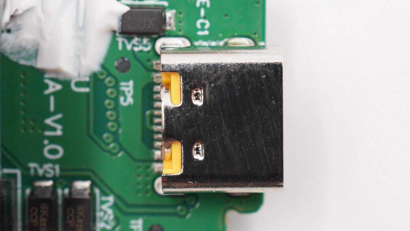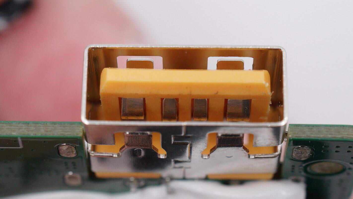 USB-A接口特写,过孔焊接,采用黄色胶芯。