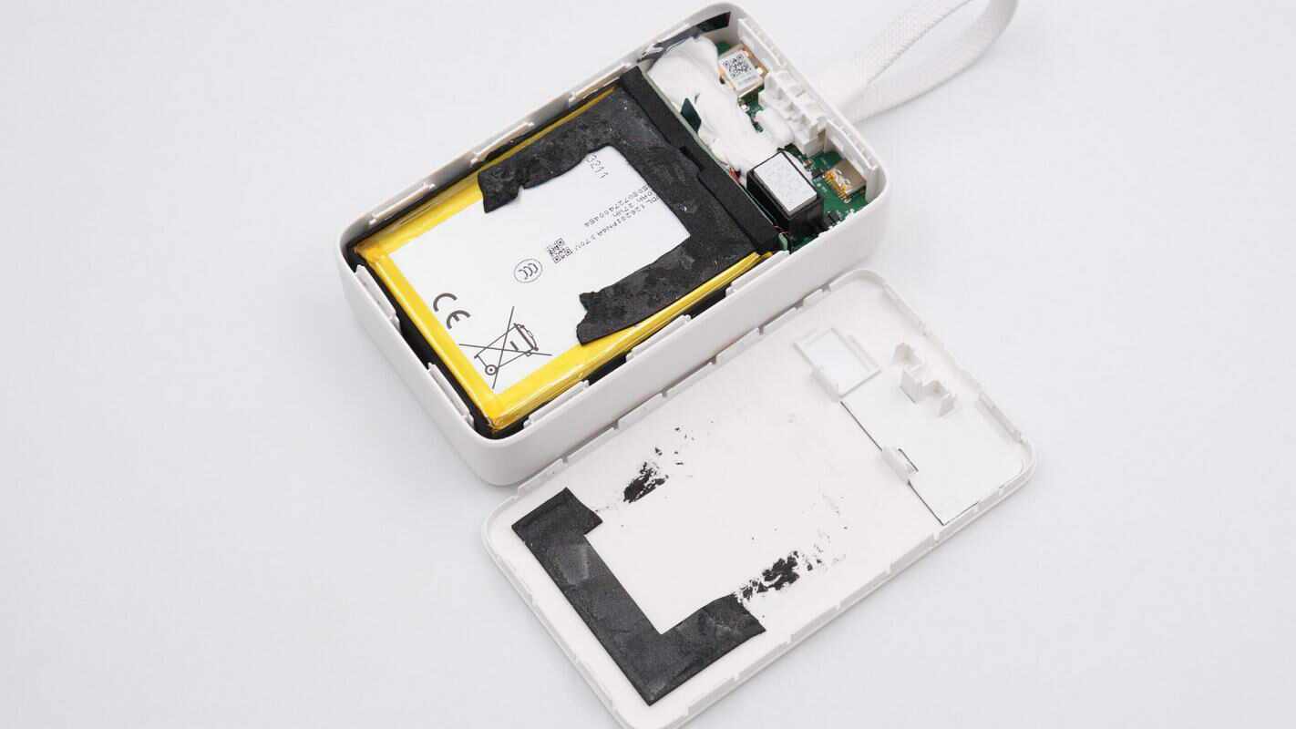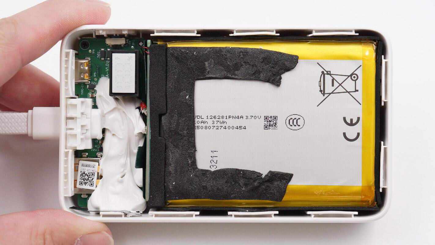 移动电源内部为PCBA模块和电池组上下分仓布局,大面积软包电池位于下半部,四周及上表面覆有黑色缓冲泡棉。