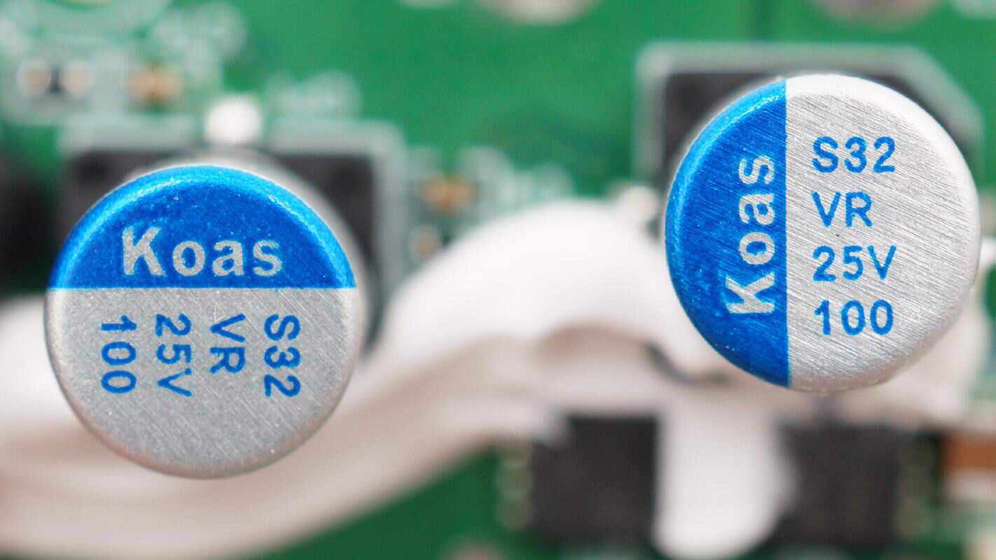 两颗滤波固态电容特写,来自KOSHIN 东佳,规格为25V100μF。