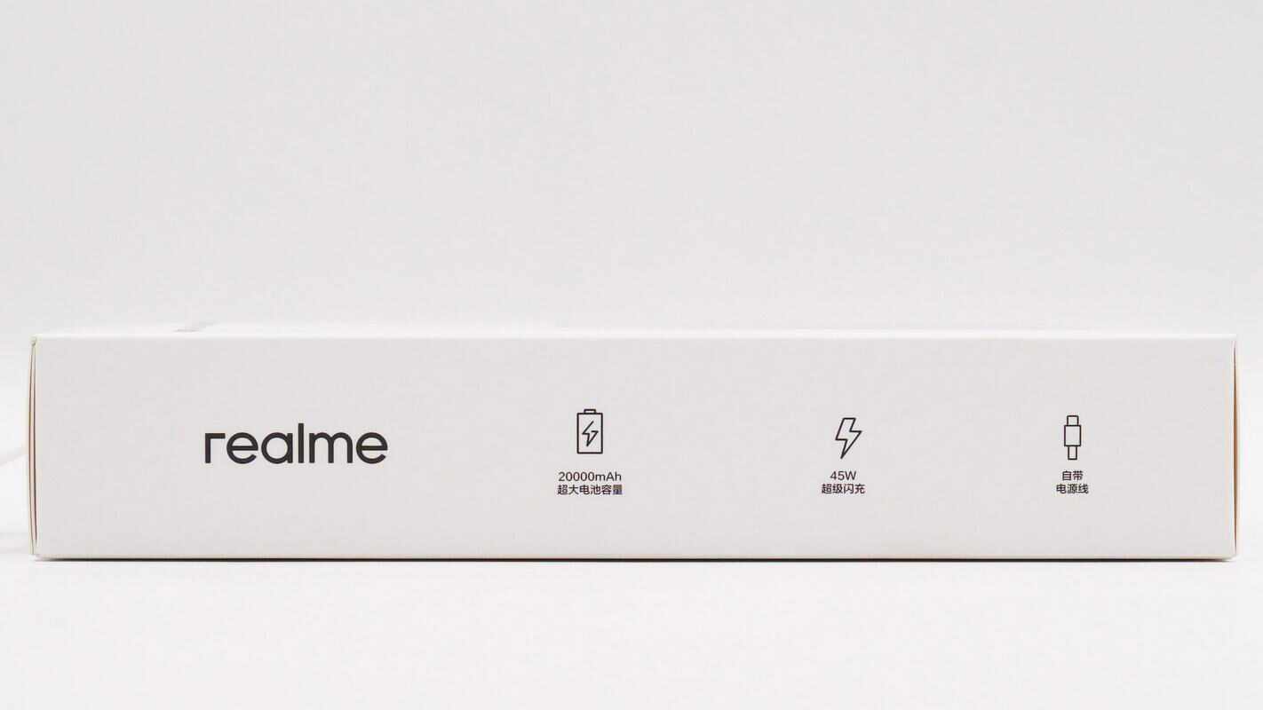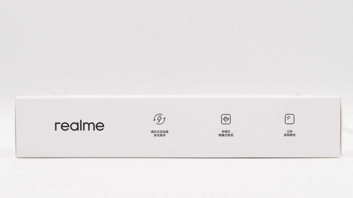 包装盒侧面印有黑色 realme 品牌 Logo,并印有产品卖点,布局规整。