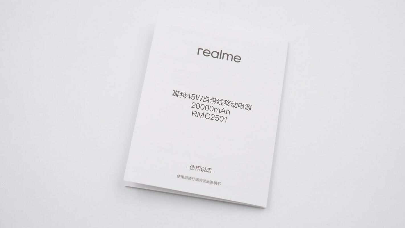 这次realme真我45W自带线移动电源的包装盒采用通体白色设计,中上部印有产品名称“真我 45W 自带线移动电源”,下方大面积展示产品外观图片,顶部带有挂钩式纸托。