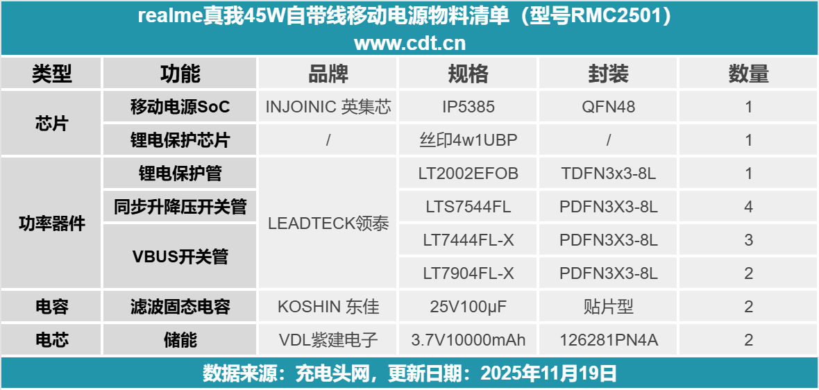 最后附上realme真我45W自带线移动电源的核心器件物料清单,方便大家查阅。
