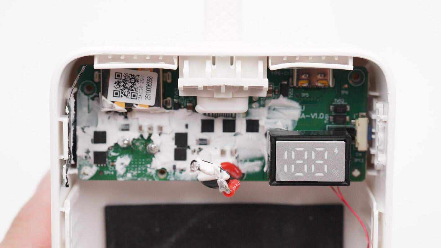 充电头网通过拆解发现,电源内置2块紫建电子软包电芯,两块电芯串联,电芯型号126281PN4A,标称电压3.7V,标称容量10000mAh,目前已通过CCC认证。并附有锂电保护芯片搭配锂电保护管,进行电池组管理和保护。电池组四周大量泡棉包覆,叠加青稞绝缘纸、电芯侧贴 NTC 温度采样及独立电池保护板,用料方面非常实在。