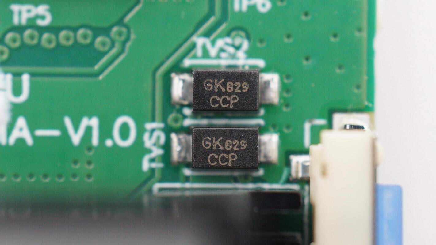 两颗 TVS 瞬态电压抑制二极管特写,丝印GK829。