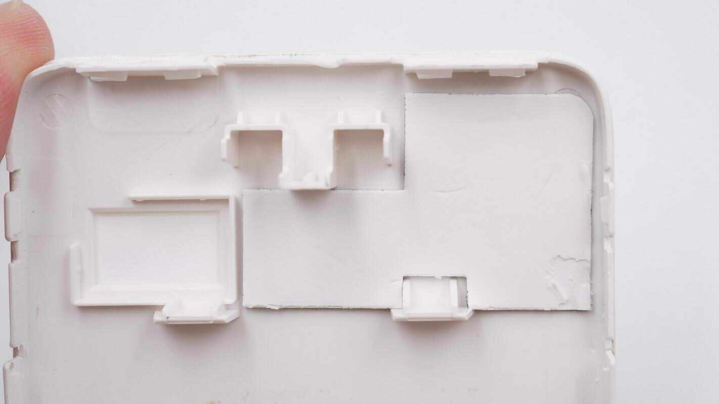 从正面板近距离特写也能看出右侧矩形正对应白色灌胶区域,用于将热量传导到前壳。左侧矩形开窗对应正面数码显示区域,用于给数显屏预留透光窗口。