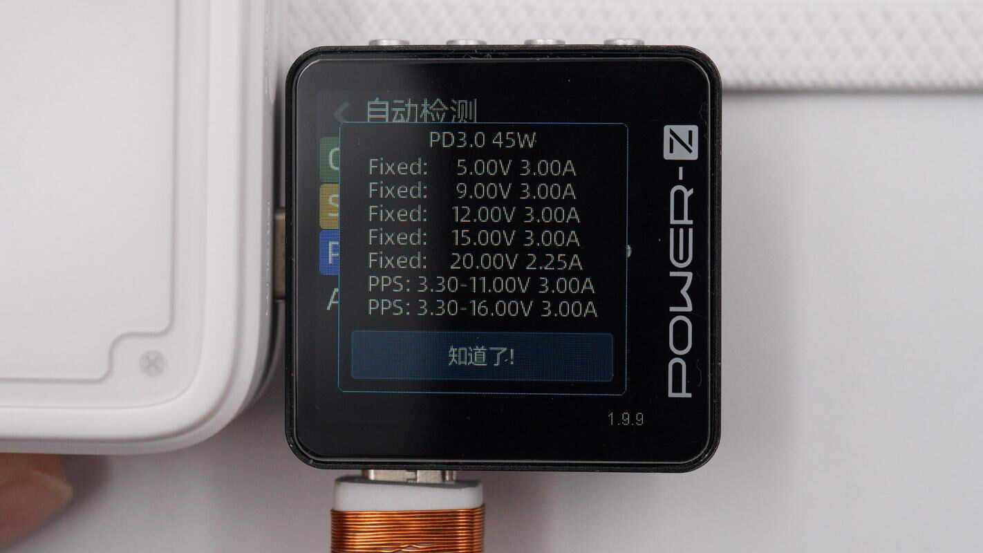 PDO报文方面,USB-C端口具备5V3A,9V3A,12V3A,15V3A,20V2.25A五组固定电压档位,以及3.3-11V/3A和3.3-16V/3A两组PPS电压档位。
