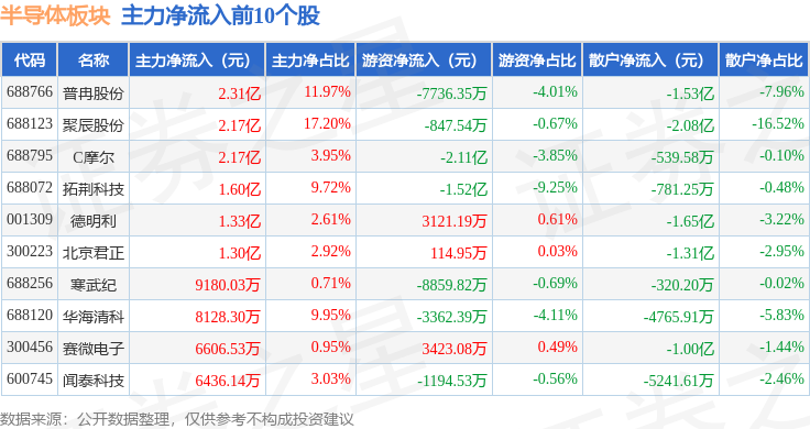 从资金流向上来看,当日半导体板块主力资金净流出39.08亿元,游资资金净流入18.05亿元,散户资金净流入21.03亿元。半导体板块个股资金流向见下表: