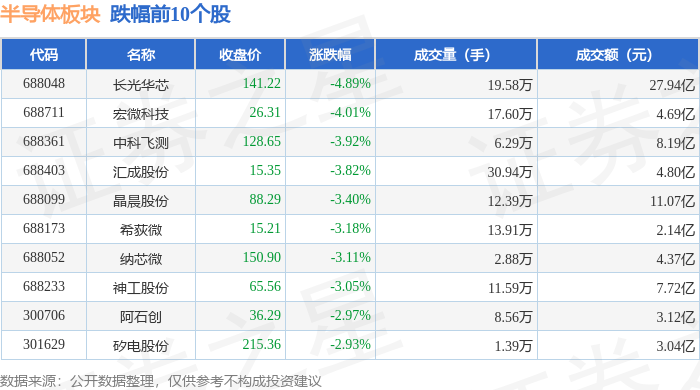 证券之星消息,12月9日半导体板块较上一交易日下跌0.3%,长光华芯领跌。当日上证指数报收于3909.52,下跌0.37%。深证成指报收于13277.36,下跌0.39%。半导体板块个股涨跌见下表: