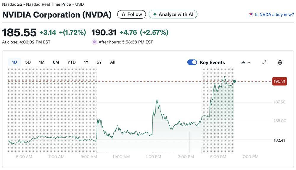 英伟达的股价在美国商务部将批准对华销售的消息传出后攀升,随后回落。该股盘后上涨近2%。