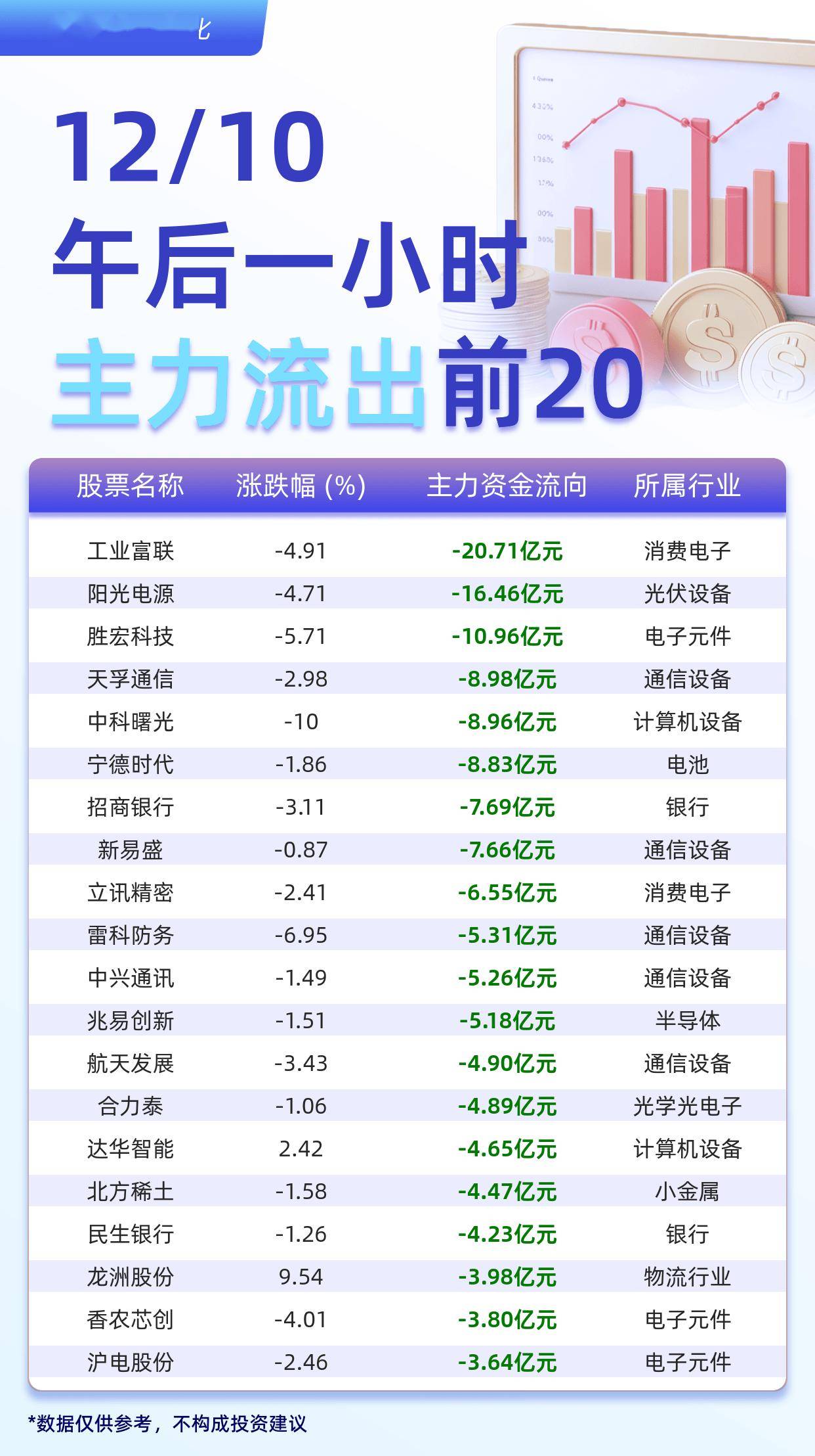 据交易所数据显示,截至12月10日午后一小时,主力资金流出前20的股票分别为: 工业富联(-20.71亿元)、 阳光电源(-16.46亿元)、 胜宏科技(-10.96亿元)、 天孚通信(-8.98亿元)、 中科曙光(-8.96亿元)、 宁德时代(-8.83亿元)、 招商银行(-7.69亿元)、 新易盛(-7.66亿元)、 立讯精密(-6.55亿元)、 雷科防务(-5.31亿元)、 中兴通讯(-5.26亿元)、 兆易创新(-5.18亿元)、 航天发展(-4.90亿元)、 合力泰(-4.89亿元)、 达华智能(-4.65亿元)、 北方稀土(-4.47亿元)、 民生银行(-4.23亿元)、 龙洲股份(-3.98亿元)、 香农芯创(-3.80亿元)、 沪电股份(-3.64亿元)。