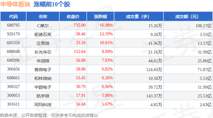 证券之星消息,12月10日半导体板块较上一交易日上涨0.29%,C摩尔领涨。当日上证指数报收于3900.5,下跌0.23%。深证成指报收于13316.42,上涨0.29%。半导体板块个股涨跌见下表: