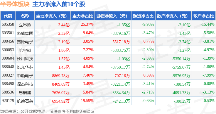 从资金流向上来看,当日半导体板块主力资金净流出26.36亿元,游资资金净流入8.43亿元,散户资金净流入17.94亿元。半导体板块个股资金流向见下表: