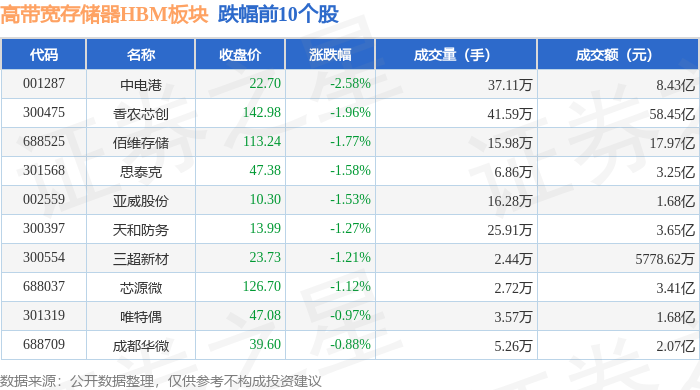 从资金流向上来看,当日高带宽存储器HBM板块主力资金净流出9.48亿元,游资资金净流入1.41亿元,散户资金净流入8.07亿元。高带宽存储器HBM板块个股资金流向见下表: