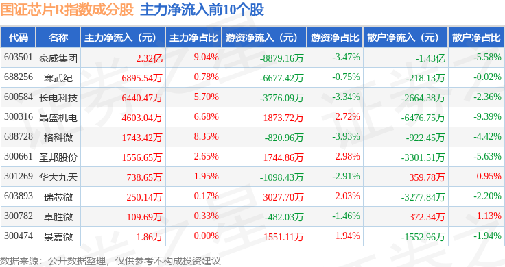资金流向方面,国证芯片R(480017)指数成份股当日主力资金净流出合计17.45亿元,游资资金净流入合计6.17亿元,散户资金净流入合计11.29亿元。成份股资金流向详情见下表: