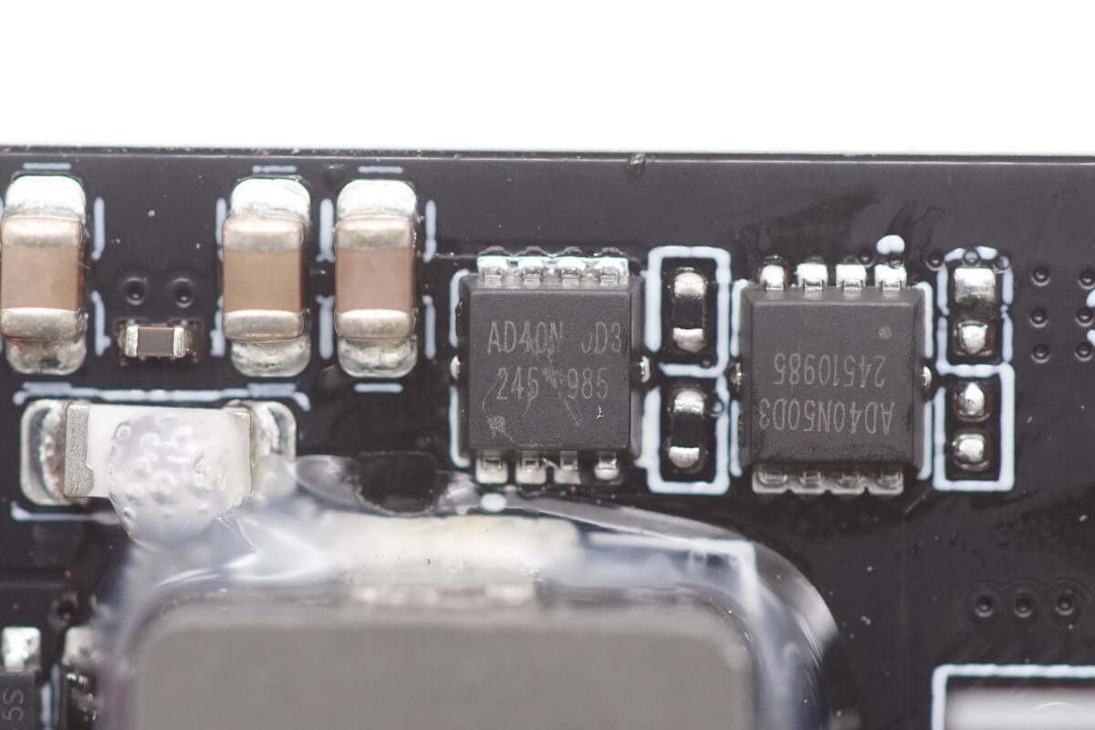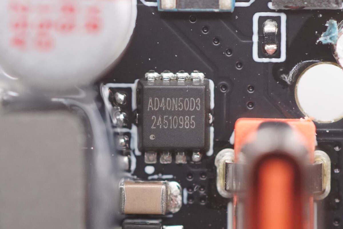 旁边与之搭配的两颗同步升降压开关管特写,型号AD40N50D3,来自Adamant砹德曼,NMOS管,耐压40V,采用PDFN3333封装。配合智融SW6308进行升降压电路控制。
