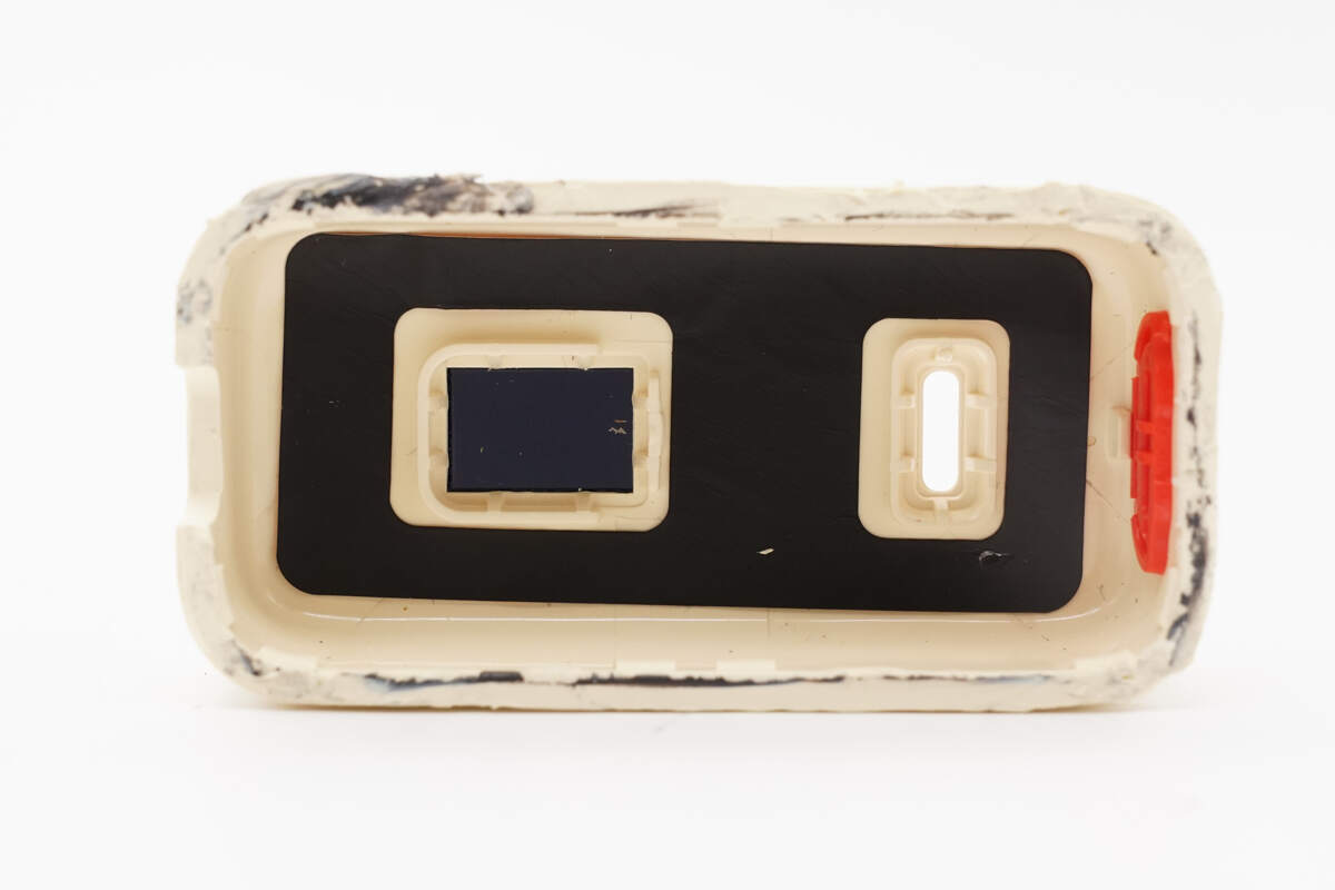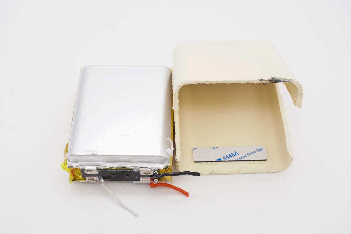 将电池组从机身壳体中取出。可以看到电池组背部与外壳内侧之间通过双面胶进行强力粘贴固定,以防止电池在携带过程中发生晃动或位移。
