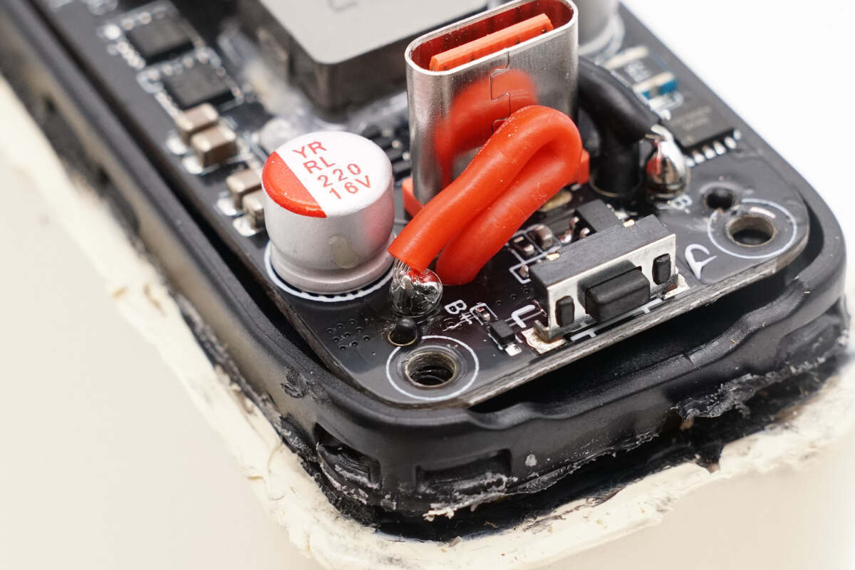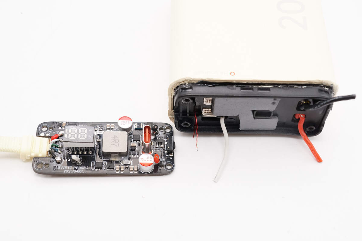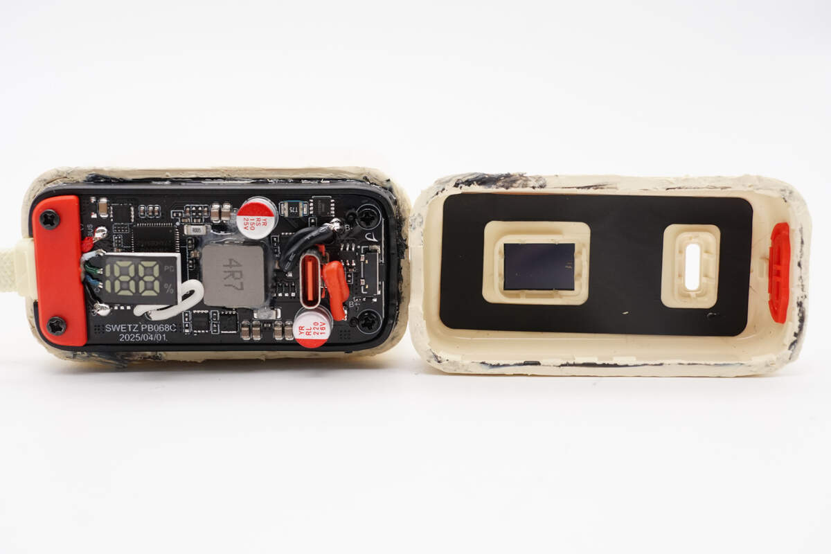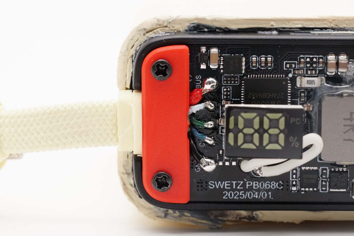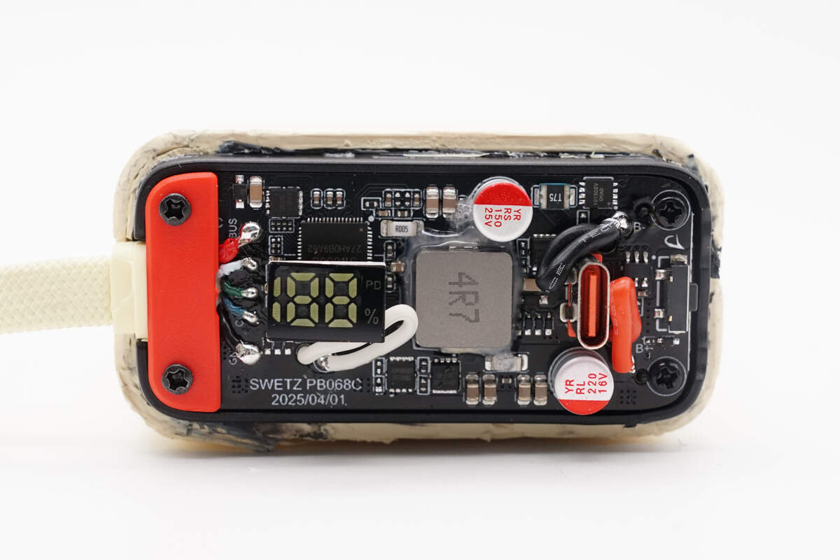 内部结构方面,移动电源主控采用智融科技SW6308移动电源SOC,集成双向升降压和多协议快充控制,并内置VBUS端半桥,让产品的集成度大大提高。产品壳体底部及两侧大面积缓冲隔热泡棉负责固定、缓冲与隔热,NTC热敏电阻深入电池组内部实时监测温度,整体用料扎实,布局合理,兼顾安全性与体积控制。