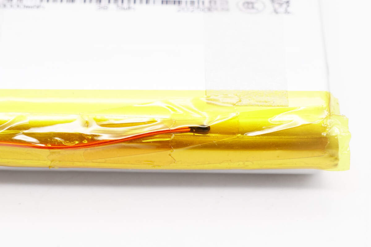 电池组由两片聚合物软包电芯组成。电芯顶部配有一块独立的电池保护板,电芯极耳通过镍片点焊连接至保护板,保护板两端及周边包裹有黄色高温胶带,进行绝缘保护。
