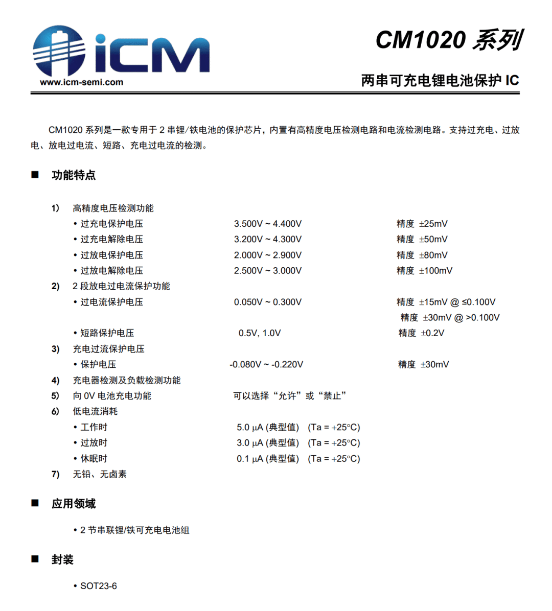 锂电保护芯片来自 ICM创芯微,丝印1020L,实际型号CM1020,这是一颗用于2串锂电池的保护芯片,芯片内置高精度电压检测电路和电流检测电路,支持电池过充电,过放电,充电过电流,放电过电流和短路保护功能,具备25mV过充电检测精度,采用SOT23-6封装。