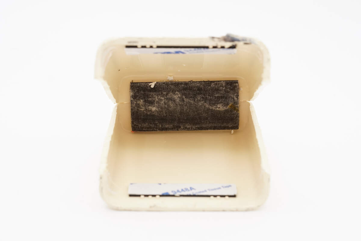 壳体底部粘贴有一大块黑色缓冲泡棉,用于承托电池组底部,起到减震缓冲作用。
