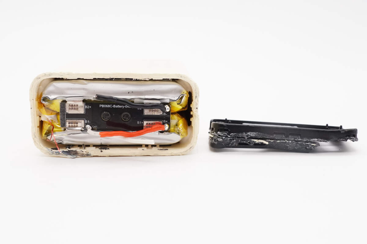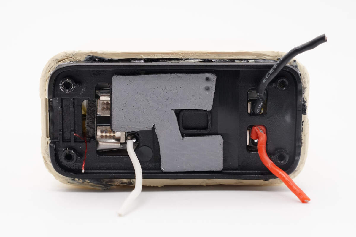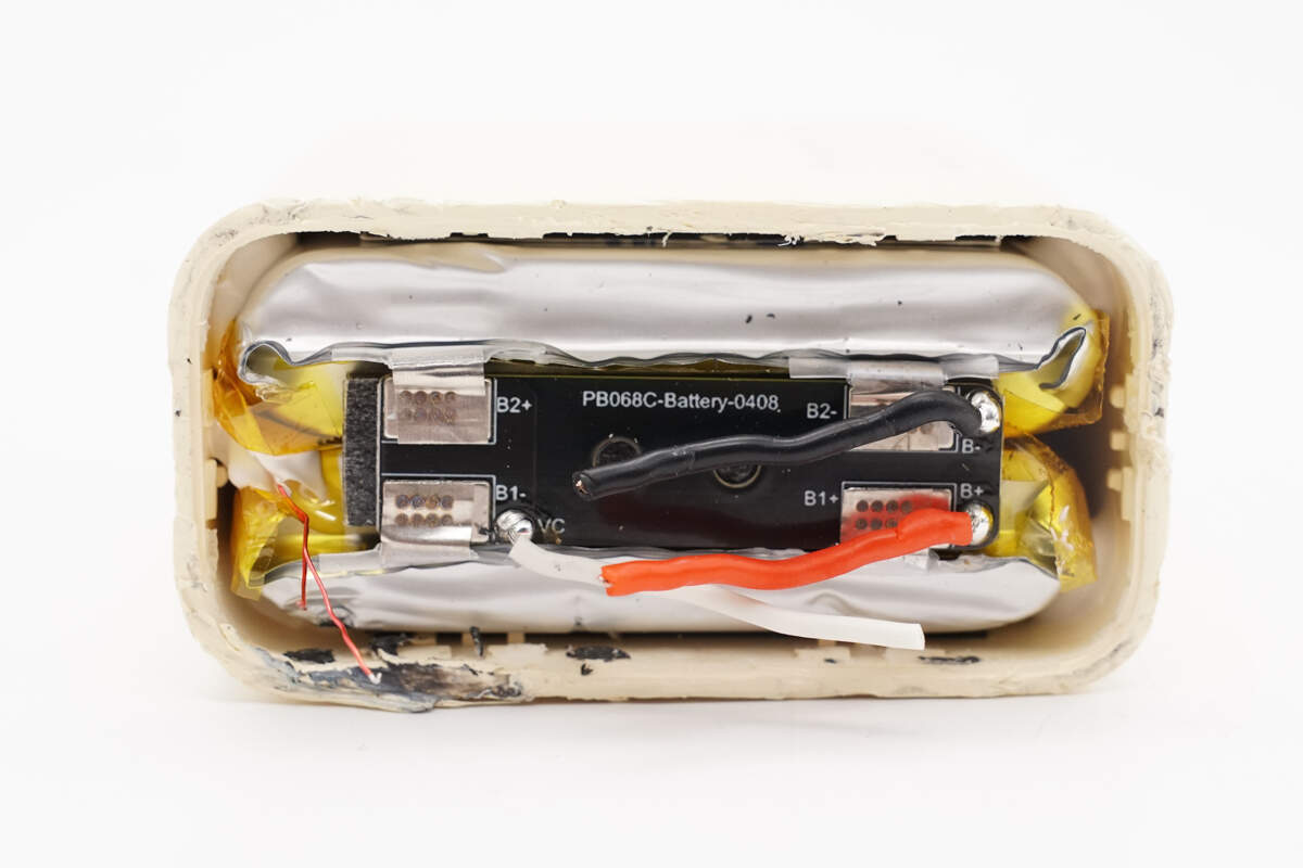 分离后可以看到PCBA模块下面的塑料支架,可以看到电池组顶部覆盖有一个黑色塑料支架,支架表面粘贴有一大块灰色导热硅胶垫,用于填充PCBA与支架之间的空隙,支架两侧预留走线槽,红黑电源线及白色信号线穿孔而出。