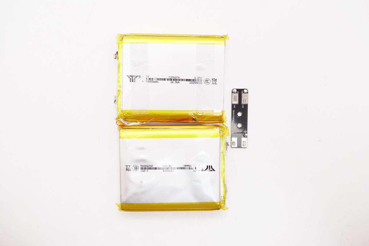 观察电芯喷码,该电芯来自TY拓远,型号为 1376074,标称电压 3.85V,标称容量 10000mAh,能量 38.5Wh,两片电芯串联。
