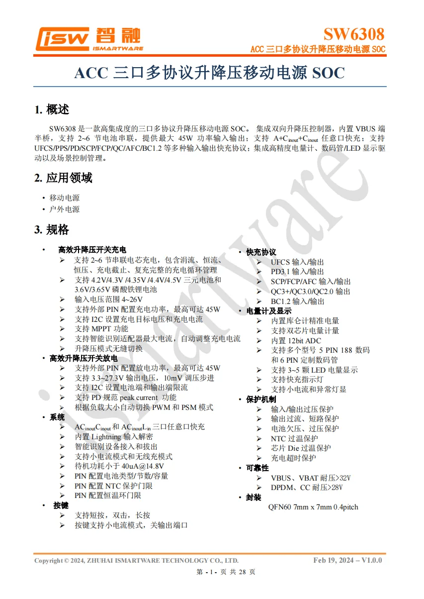 移动电源SOC特写,型号SW6308,来自iSmartWare智融科技。是一款支持USB-C,USB-A和Lightning接口的高性能移动电源SOC芯片,具有4V至26V的输入电压范围,同时支持2-6节电池串联应用,可提供高达45W的输入输出。