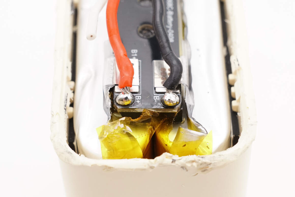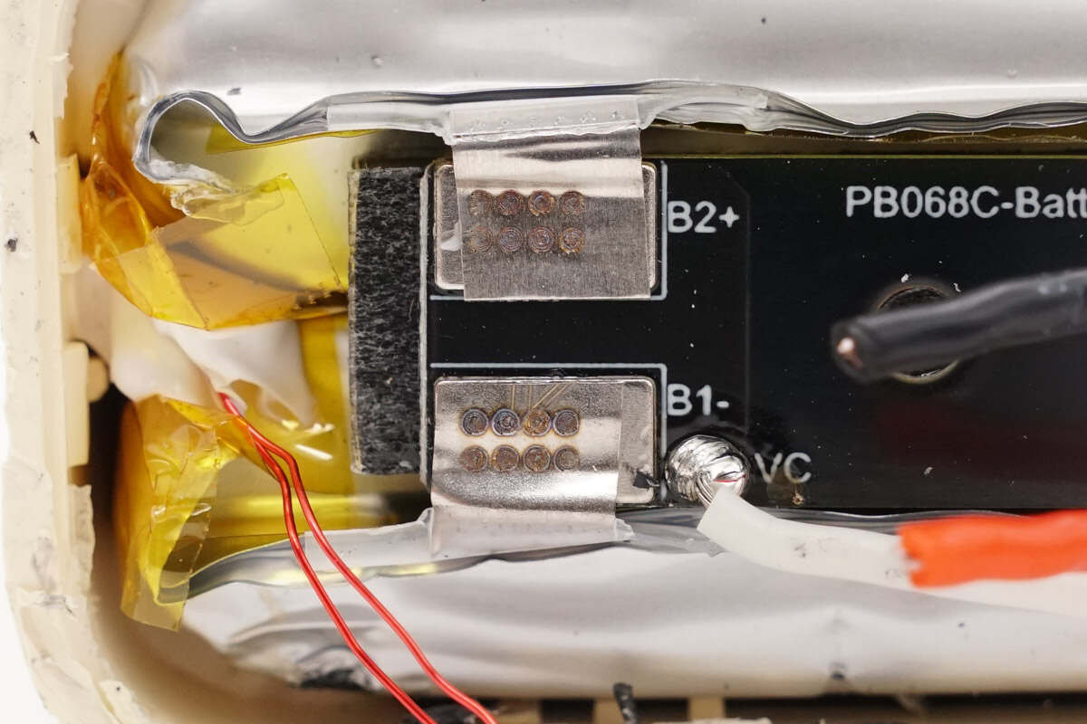 电池保护板连接处特写。红、黑两条硅胶导线分别焊接在 B+ 和 B- 焊盘上,作为电池组的正负极输出。