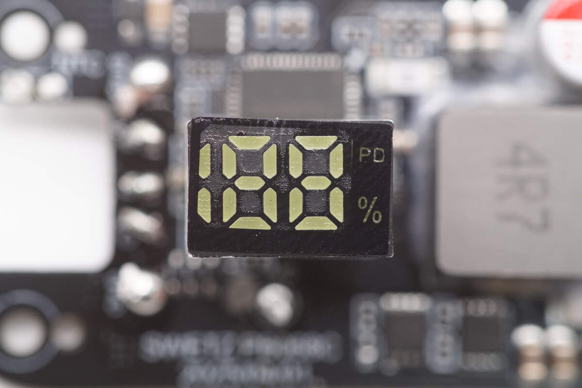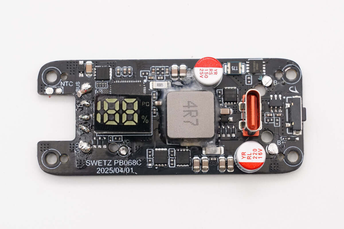 升降压电感右侧设有一颗固态电容进行输出滤波,旁边是USB-C母座。左侧设有一颗LED数码管显示屏,用于电量显示,移动电源主控芯片在显示屏下方,PCB板上方还有一颗输入滤波固态电容,板端左侧预留了自带线的焊接孔位。