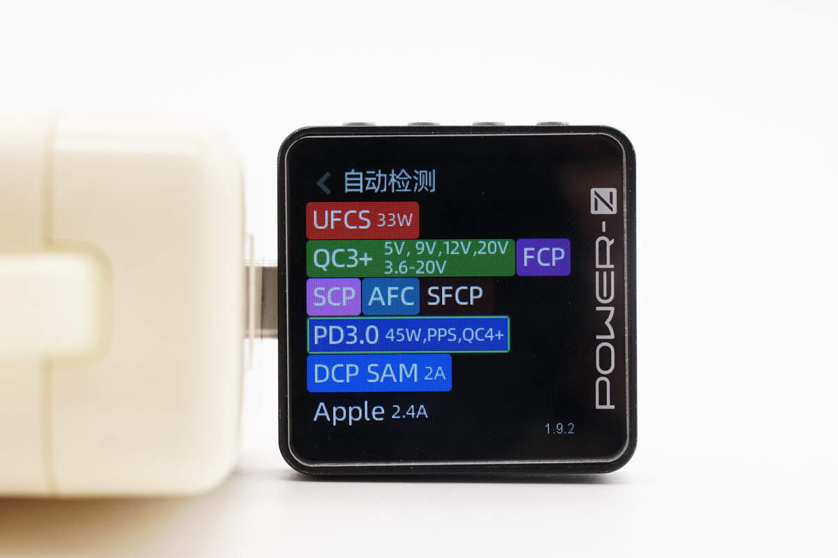 接下来测试另一个USB-C接口,实测支持 UFCS、QC3+、FCP、SCP、SFCP、AFC、PD3.0、PPS、QC4+、DCP SAM 2A 以及 Apple 2.4A 充电协议。