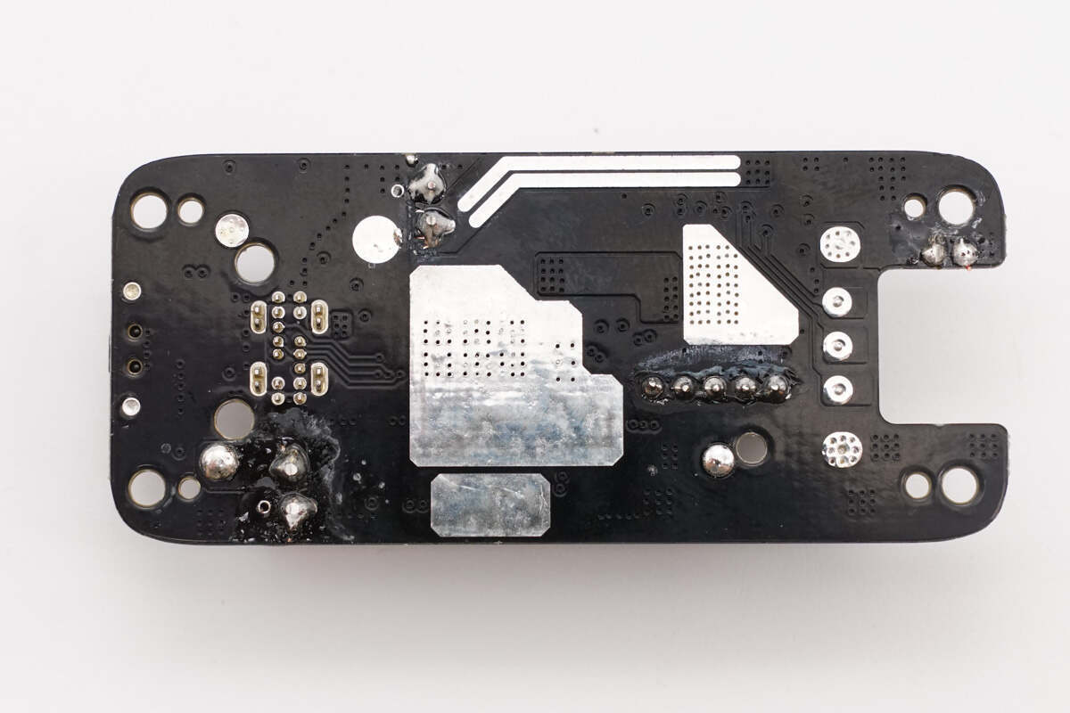 PCBA模块背面未焊接电子元器件。对应正面发热较大的主控芯片、电感以及升降压开关管区域,背面做了大面积露铜加锡处理,增强导热能力。