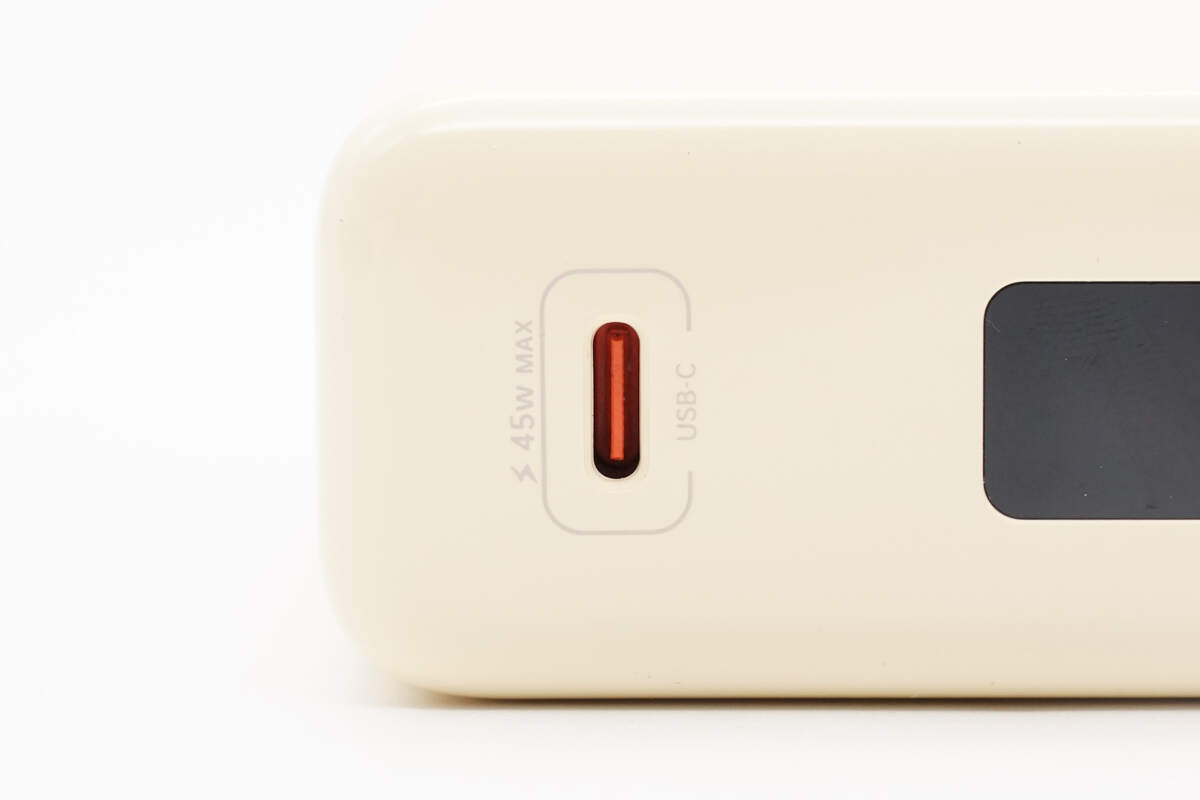 USB-C母座采用红色胶芯,上方印有“45W Max”快充标识。