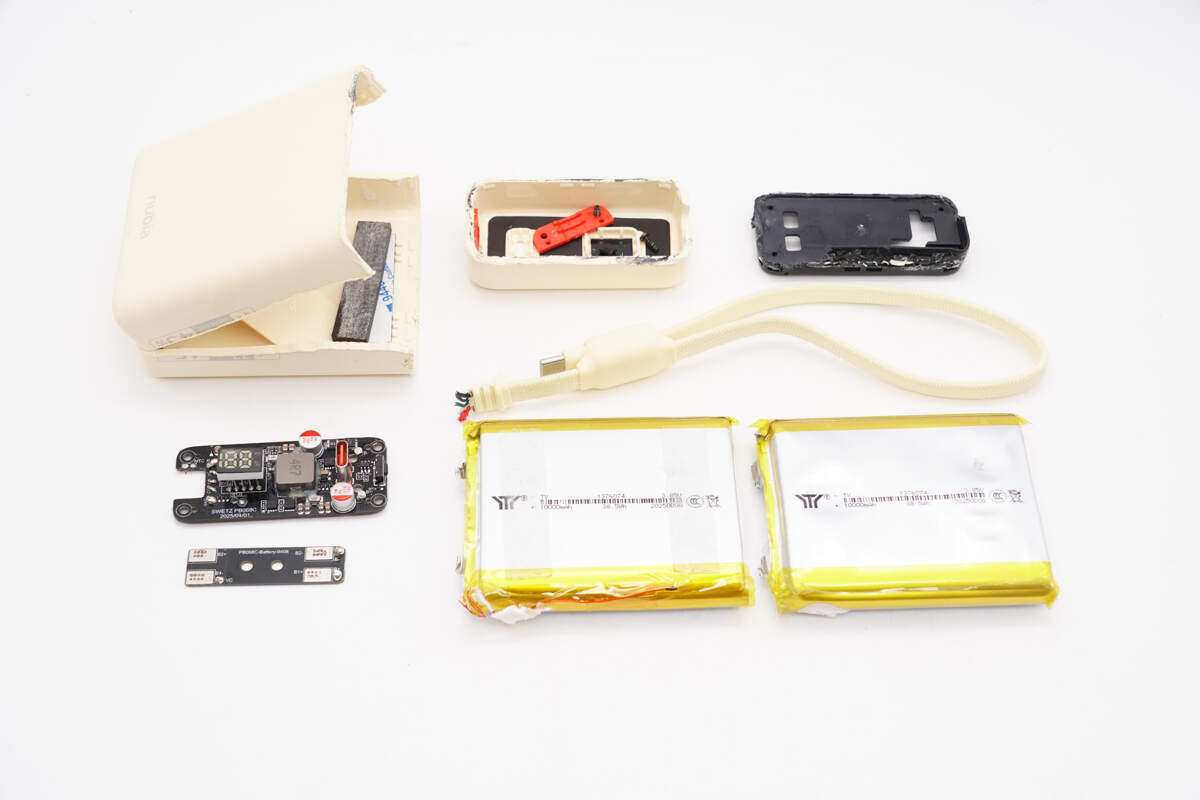 充电头网拆解了解到,内部采用两片来自 TY 拓远的聚合物软包电芯串联组成电池组,采用创芯微 CM1020 负责 2 串锂电池的过充、过放、过流及短路保护,外围配合大面积镍片焊接与青稞纸绝缘,安全与可靠性有充分保障。PCBA 模块与电池之间通过塑料支架、导热硅胶垫、石墨散热片以及底部缓冲泡棉多层结构支撑与导热,能很好保证内部结构强度与缓冲防震。